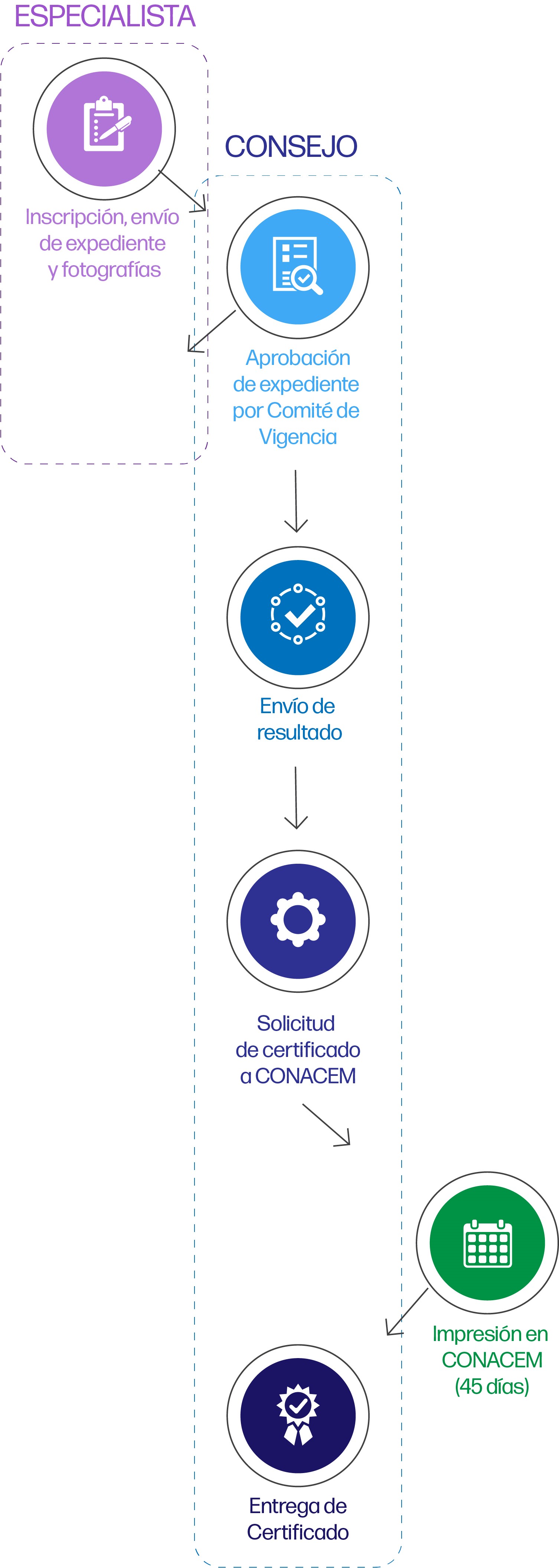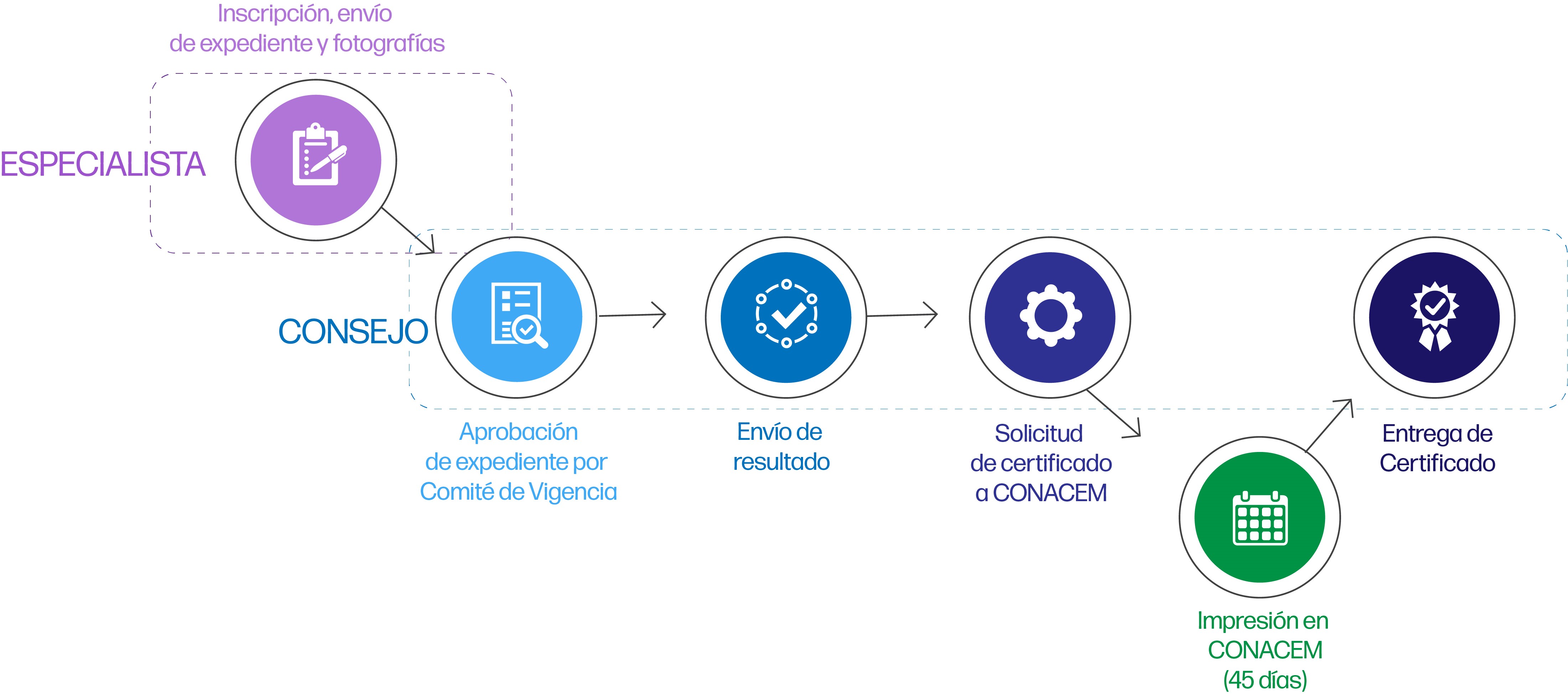 * Le informamos que, cumpliendo con las disposiciones de CONACEM, a partir del 1º de enero de 2024 no se extenderá prórroga alguna para la obtención de la vigencia de certificación por puntaje. La puntuación para obtener la Vigencia de Certificación será a partir de ese momento de 250 puntos y habrá que tramitarse antes del vencimiento de su vigencia. Una vez concluido ese tiempo, tendrá que presentar examen para obtener la vigencia.